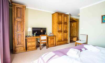 Vybavenie izby: manželská posteľ, LCD TV so SAT, minibar, telefón, wifi, trezor, pracovný stôl, skriňa na odkladanie, WC, sprchovací kút, fén, uterákový servis.