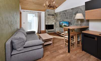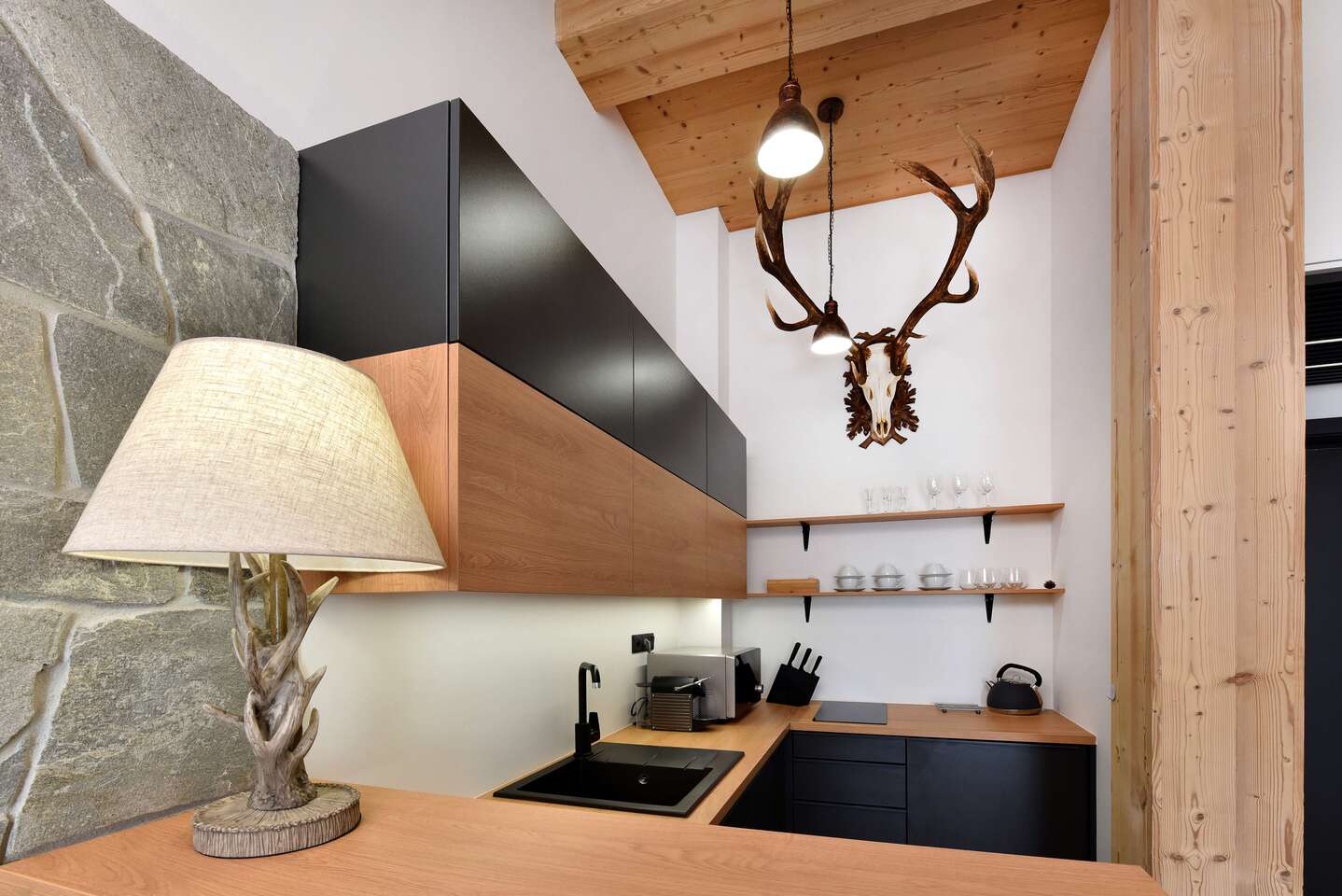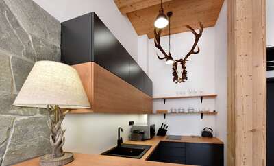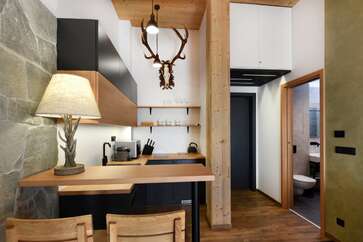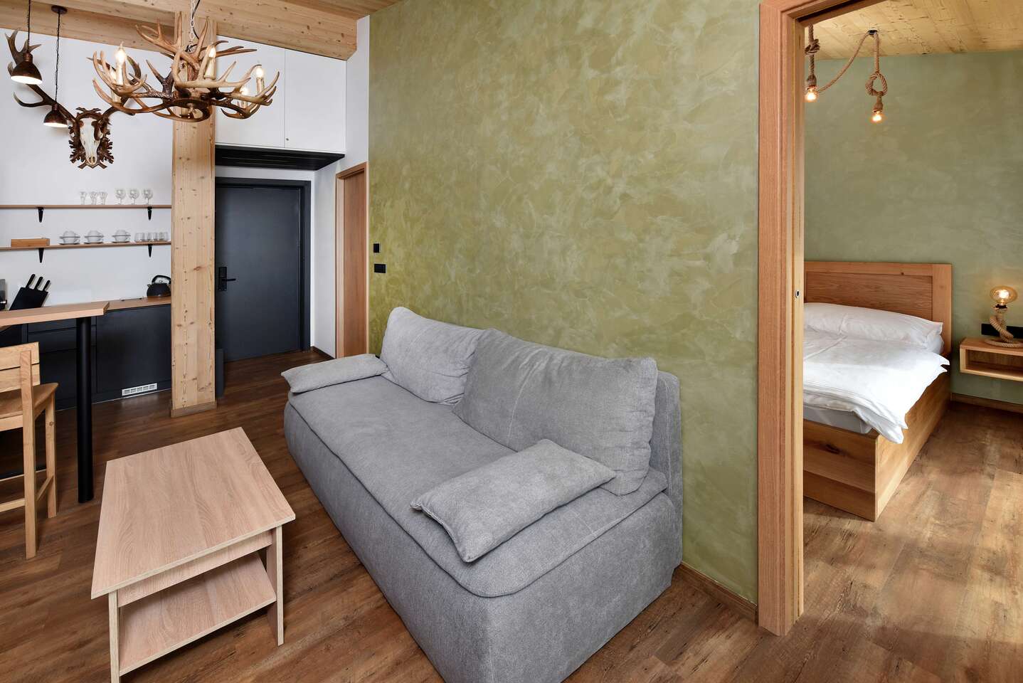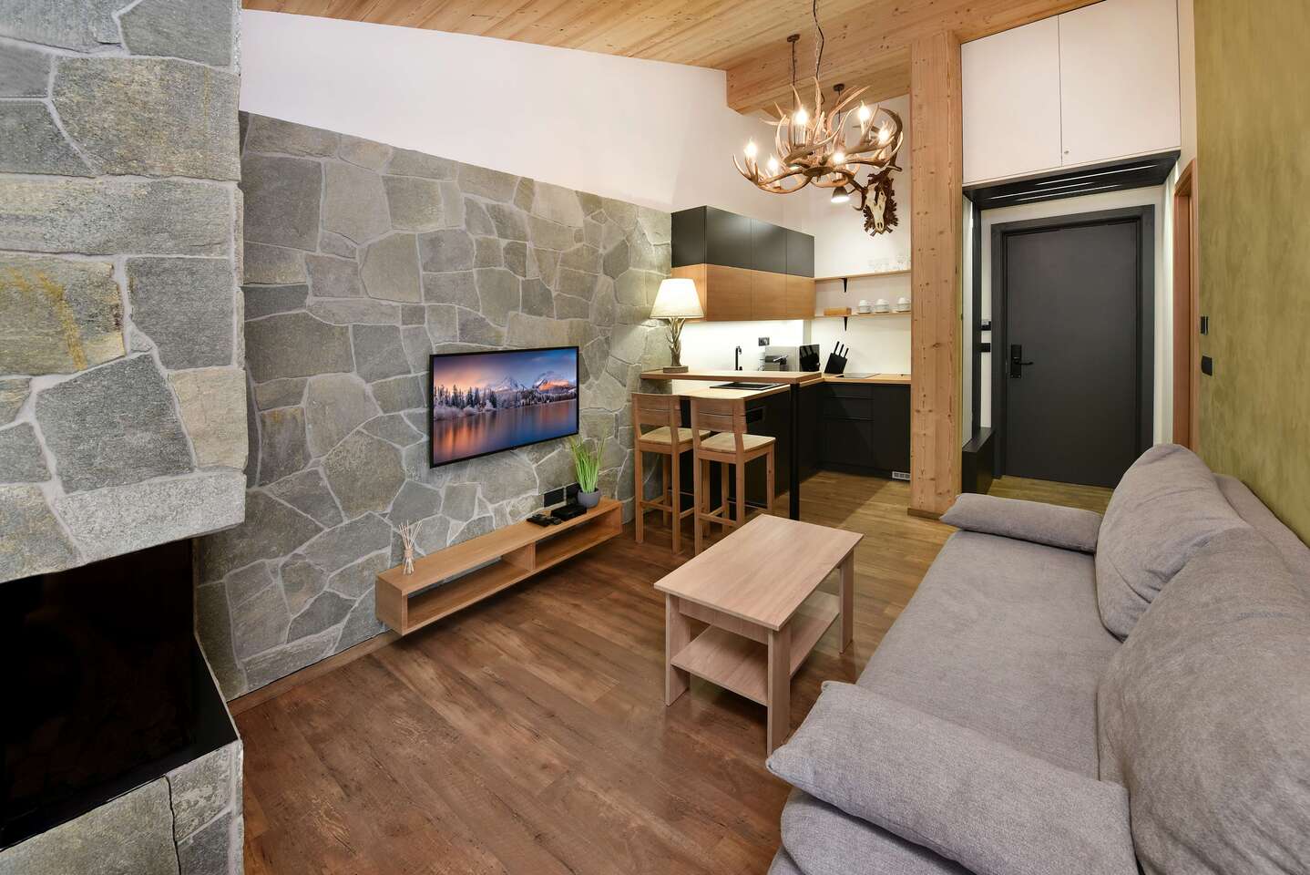 Apartmán disponuje spálňou s manželskou posteľou, kuchyňou (umývačka riadu, varná doska, varná kanvica, chladnička, Nespresso kávovar, mikrovlna rúra), obývacou izbou s pohovkou a TV so satelitnými programami, jedálenským kútom a kúpeľňou (sprchovací kút, sociálne zariadenie, fén na vlasy). Veľkou výhodou je balkón.