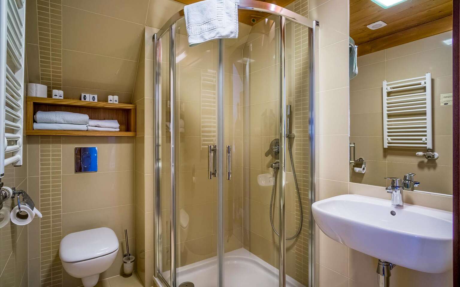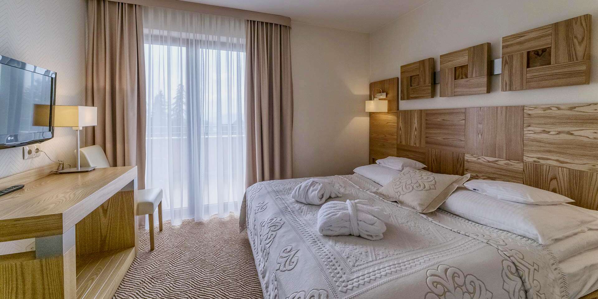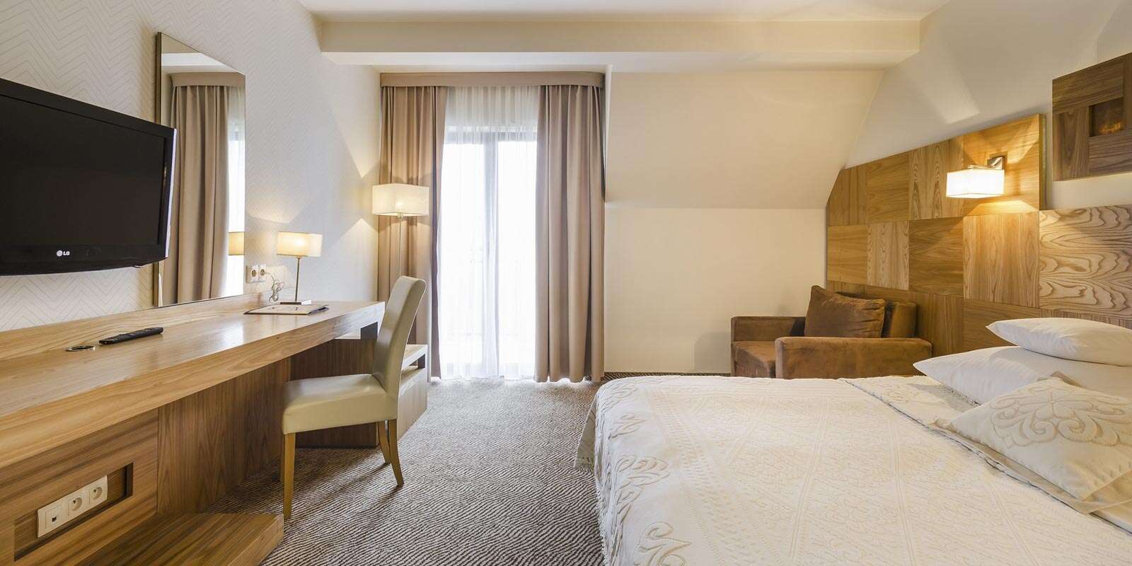 Poloha hotela je výnimočná, z väčšiny izieb môžete obdivovať majestátne Tatry. Moderné a priestranné hotelové izby sú vybavené LCD TV a prístupom na internet, kúpeľňou so sprchou a sušičom na vlasy. Väčšina izieb má tiež balkón.