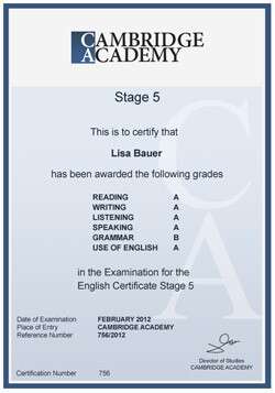Študent získa medzinárodný jazykový certifikát od Cambridge Academy, ktorý je uznávaný tisíckami medzinárodných firiem, ako sú BP, Volkswagen, Samsung, Toyota, Phillips, General Motors, LG, Allianz, Statoil, AXA, Hewlett-Packard, Fiat, Tesco, IBM.