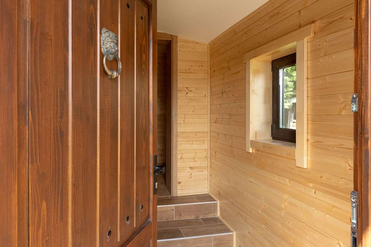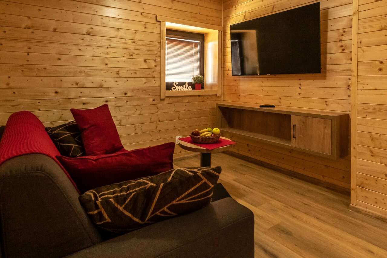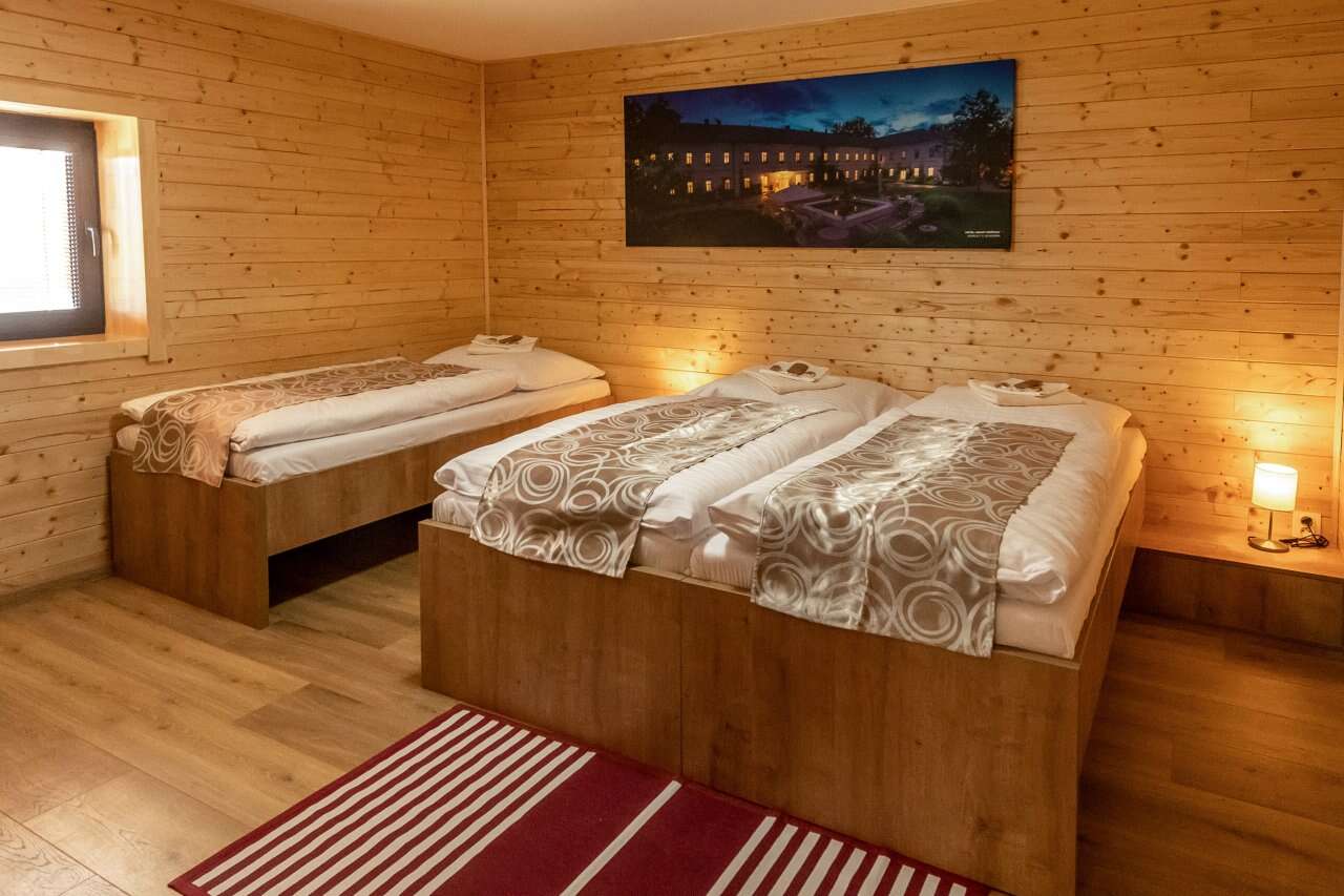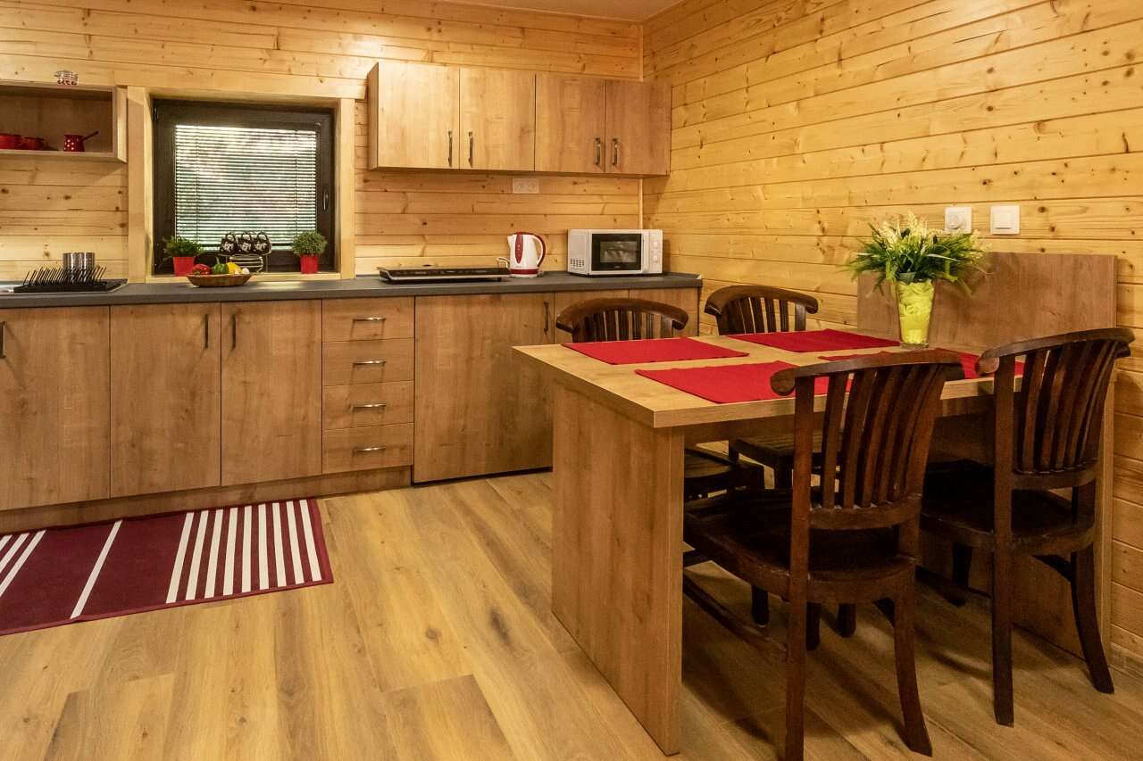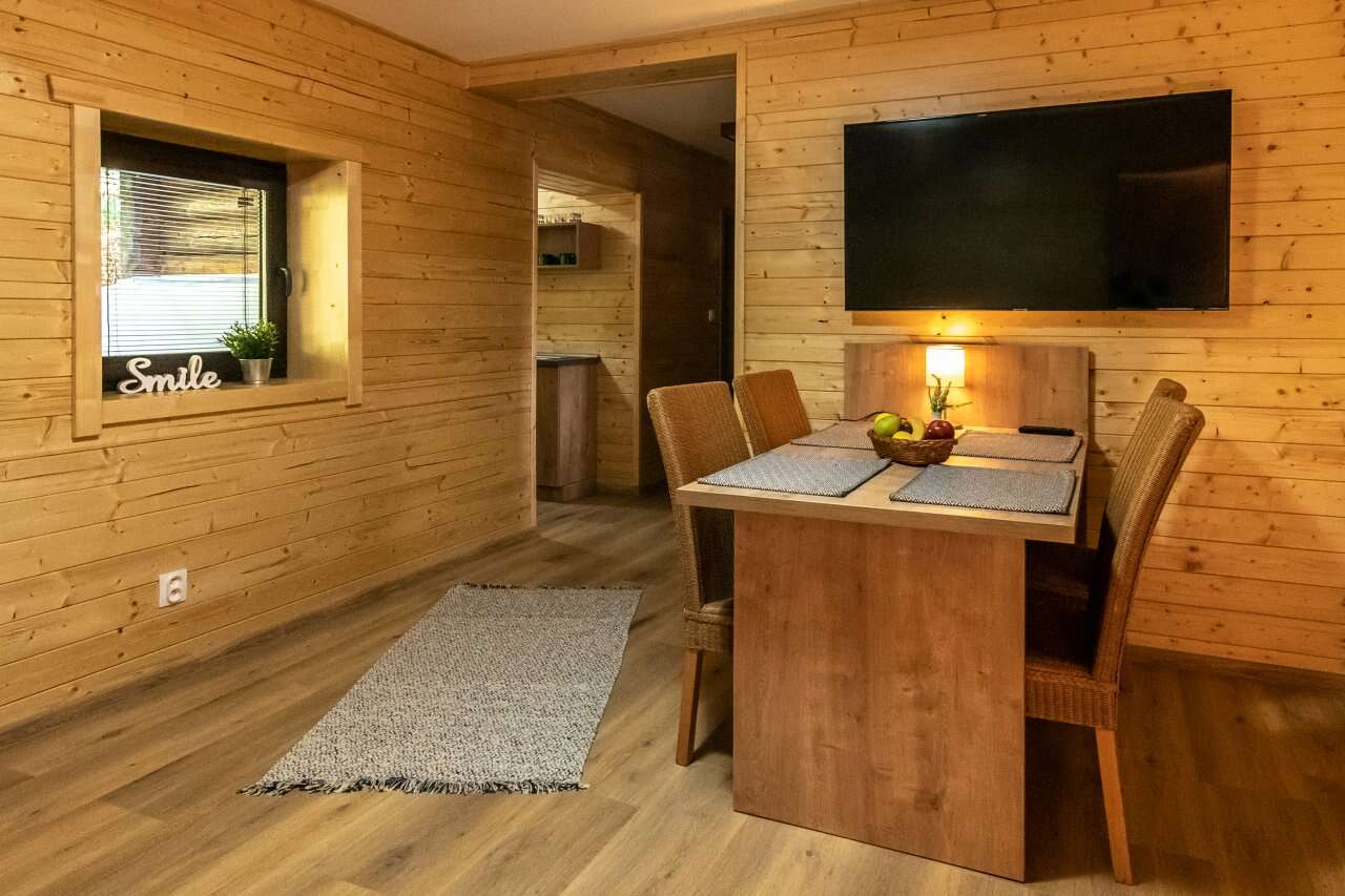 Zrubová dvoj-chatka s označením "A8" a "A9" sa nachádza neďaleko hlavnej budovy a ponúkajú súkromné ubytovanie pre rodiny alebo pre menšie skupiny viacerých osôb - zruby sa nachádzajú v tesnej blízkosti vedľa seba. Každá chatka má svoj vlastný vchod, čo zaručuje maximálne súkromie a pohodlie. V oboch zruboch nájdete okrem spálne aj obývaciu izbu, kuchyňu a kúpeľňu. Kuchyňa je plne vybavená všetkým, čo potrebujete na varenie a prípravu jedál, spolu s jedálenským stolom a stoličkami. Zrub "A8" poskytuje 5 lôžok. Zrub "A9" je 3-lôžkový a v obývacej miestnosti má navyše rozťahovací gauč. V kúpeľni sa nachádza sprchovací kút a WC. Súčasťou kúpeľne je aj fén.