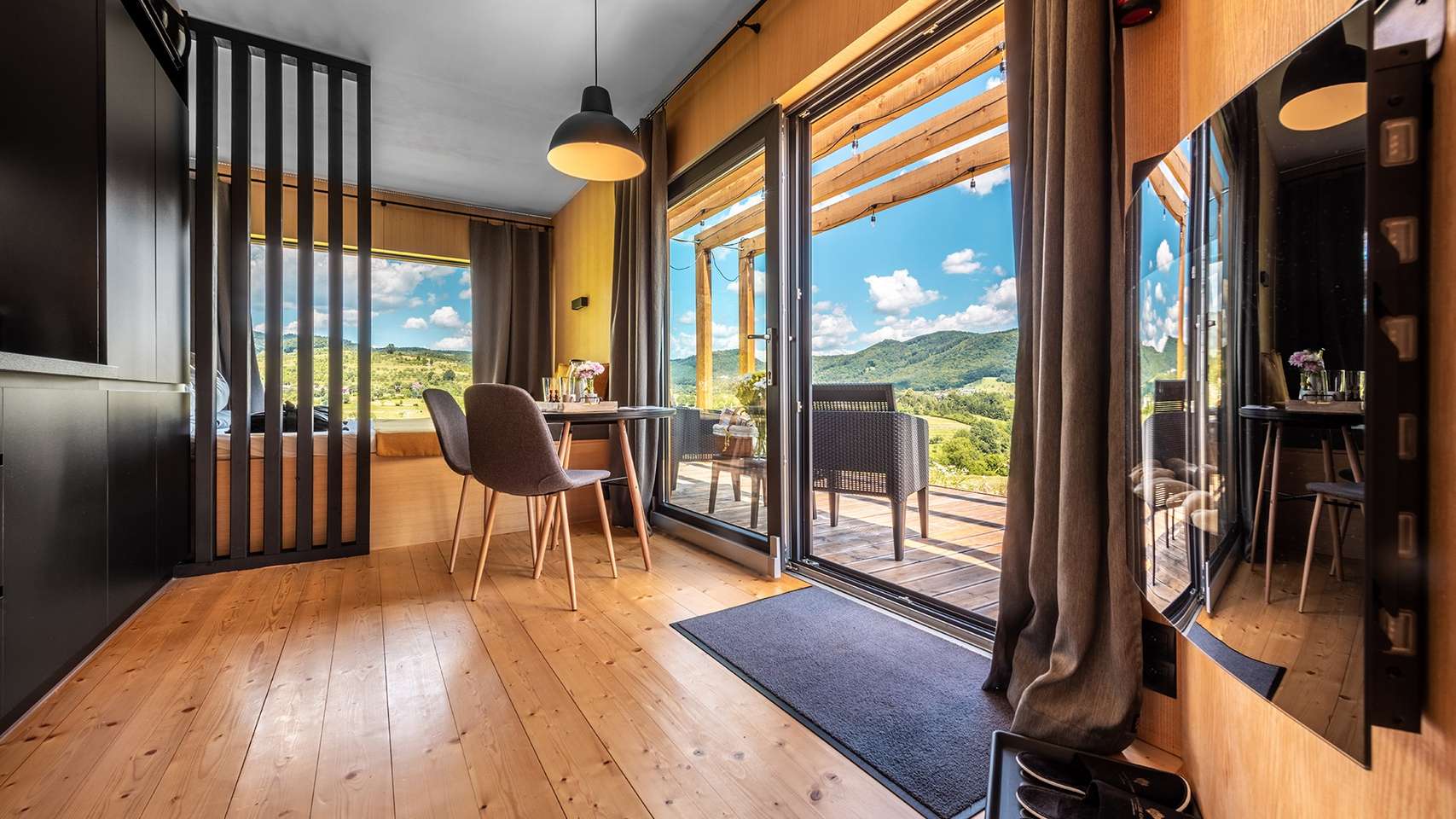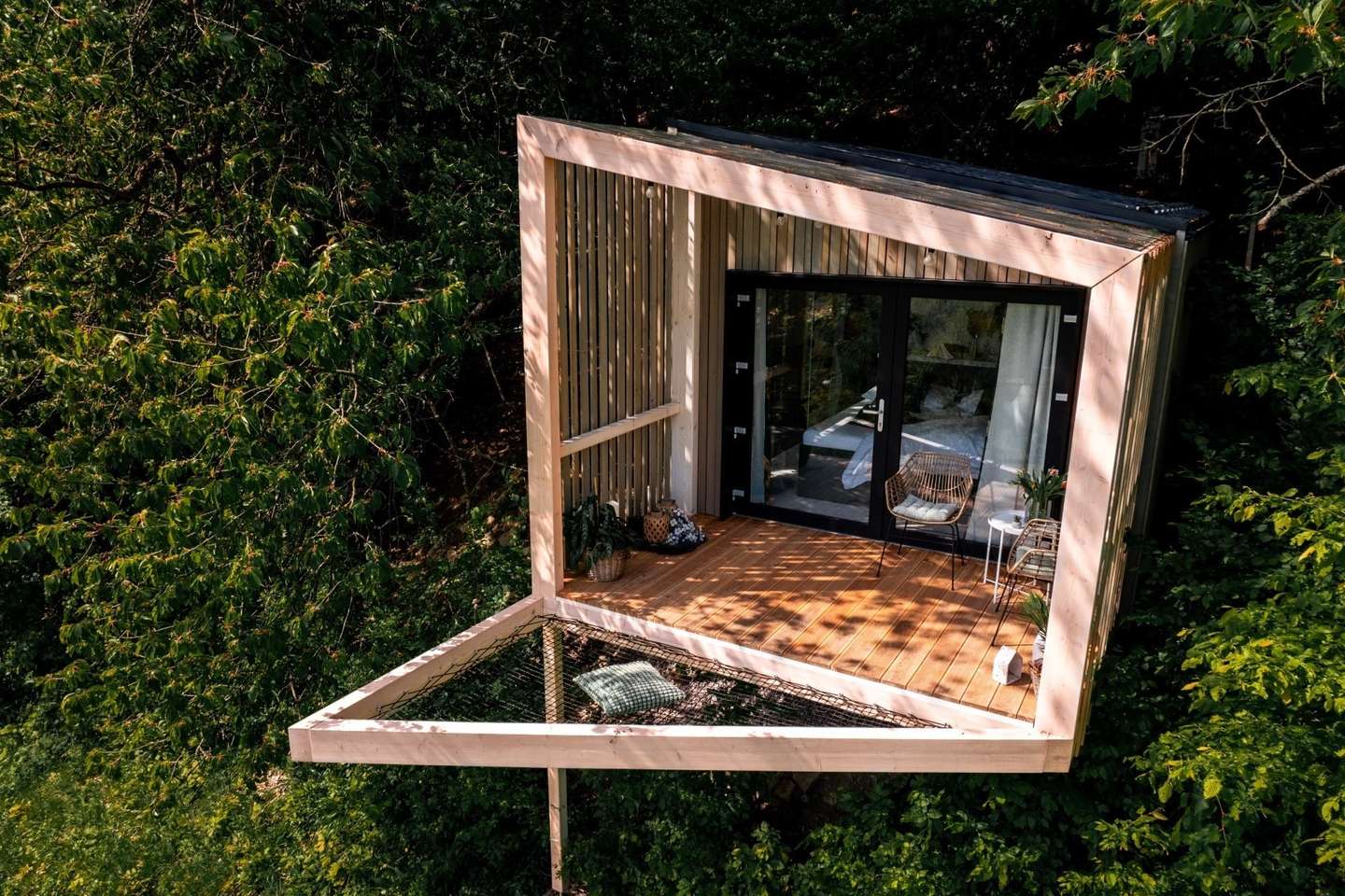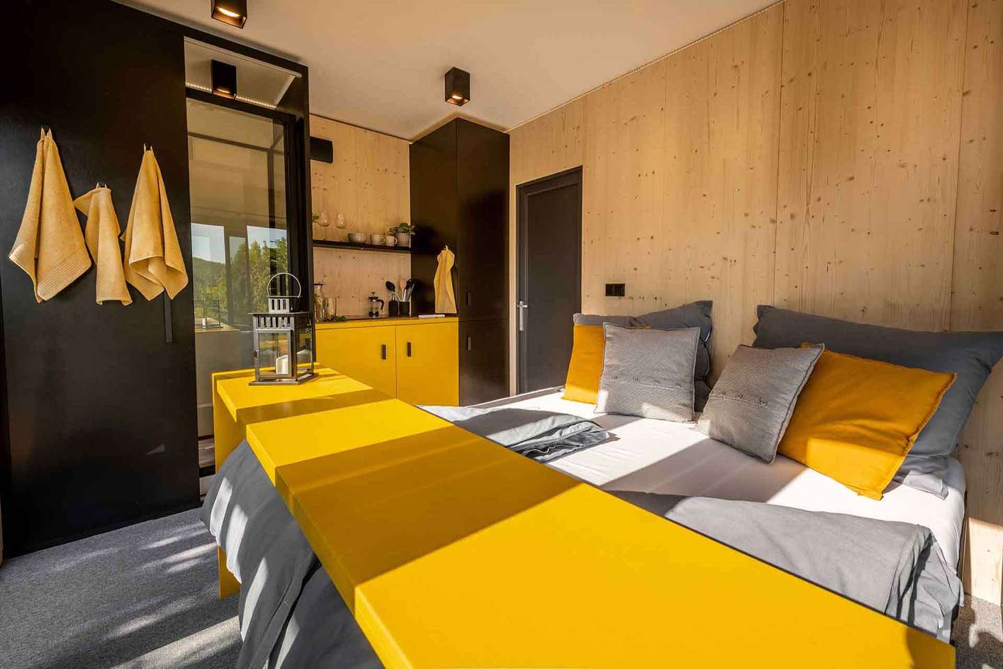 Najpokojnejšia z Kútic. Skrytá sa trochu hlbšie v lese, ponúka teda absolútne súkromie. Veľké francúzske okná vám umožnia sledovať východ slnka priamo z postele. Kutica 3 je ideálna pre tých, ktorí túžia po digitálnom detoxe a hlbokom oddychu.