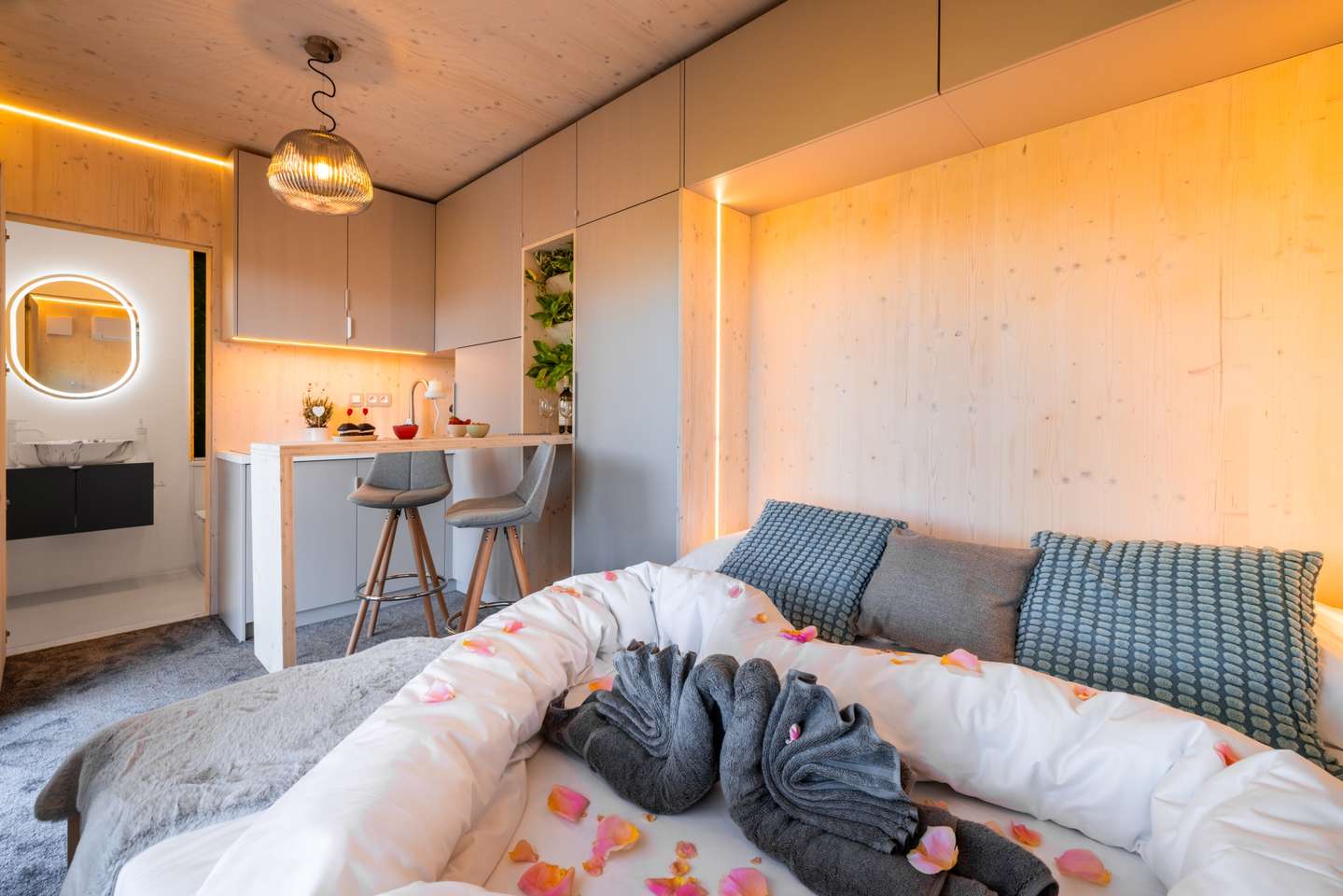 Pohodlne sa usadíte k barovému stolu a prebrať môžete plány na nasledujúce dni – oddych, oddych a ešte raz oddych. V domčeku nájdete aj plnohodnotnú kúpeľňu so sprchovým kútom a toaletou. O teplo alebo chladenie sa postará klimatizácia.