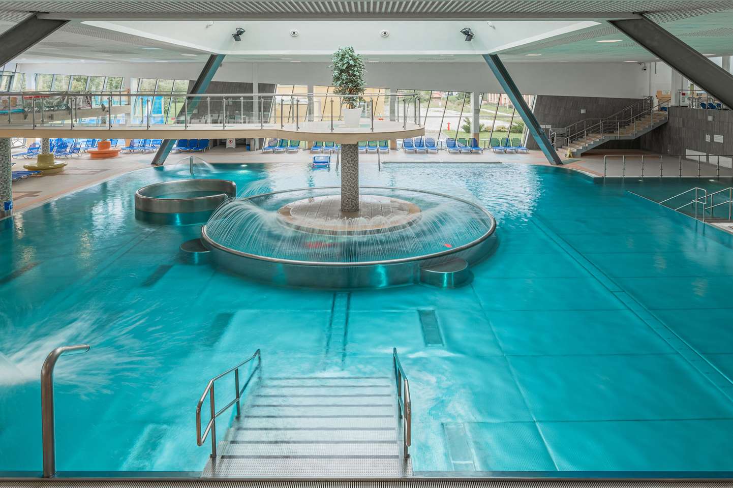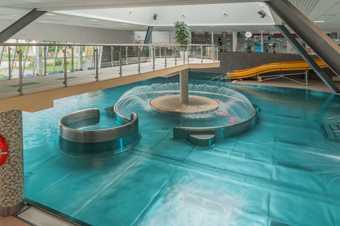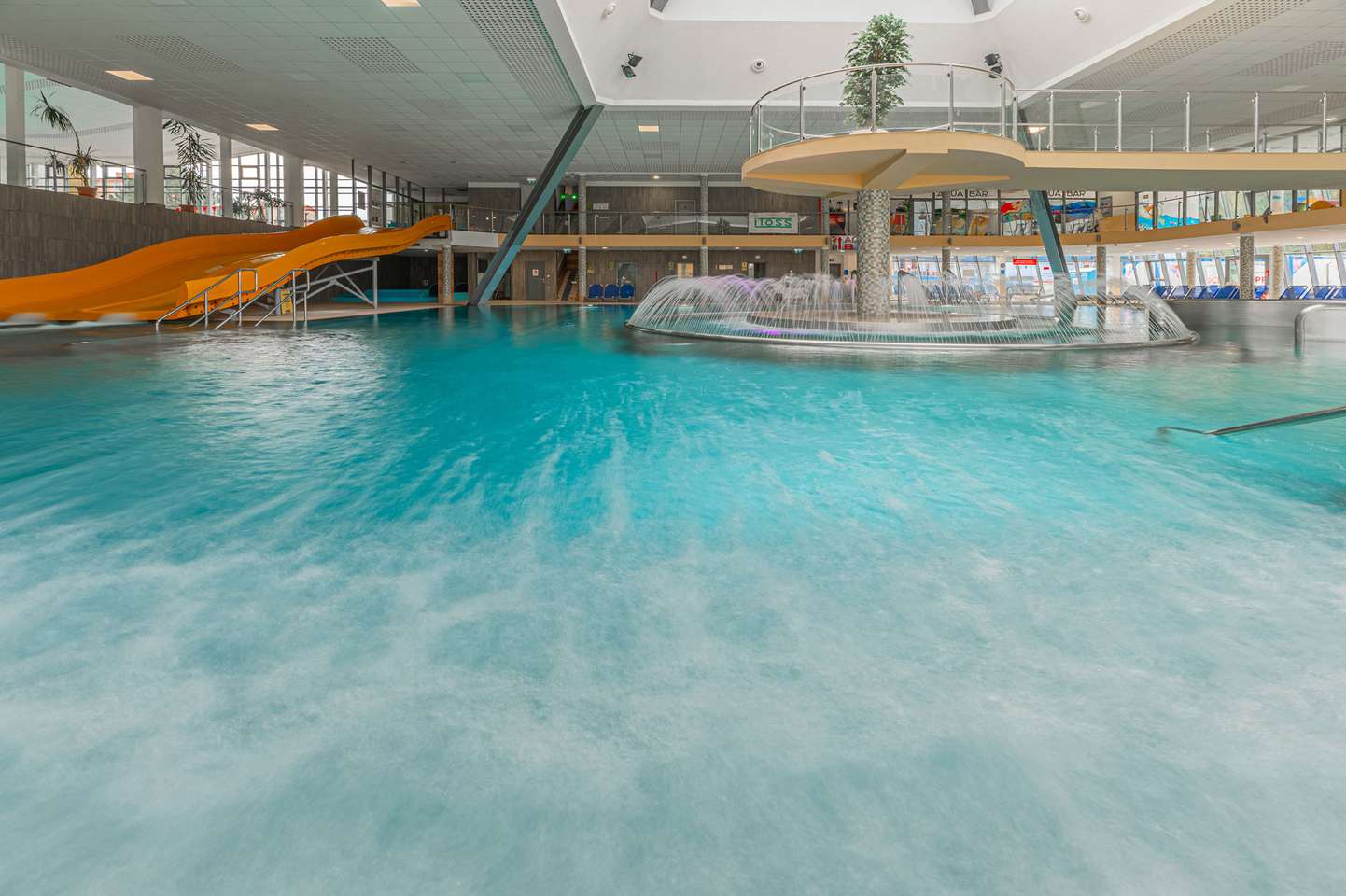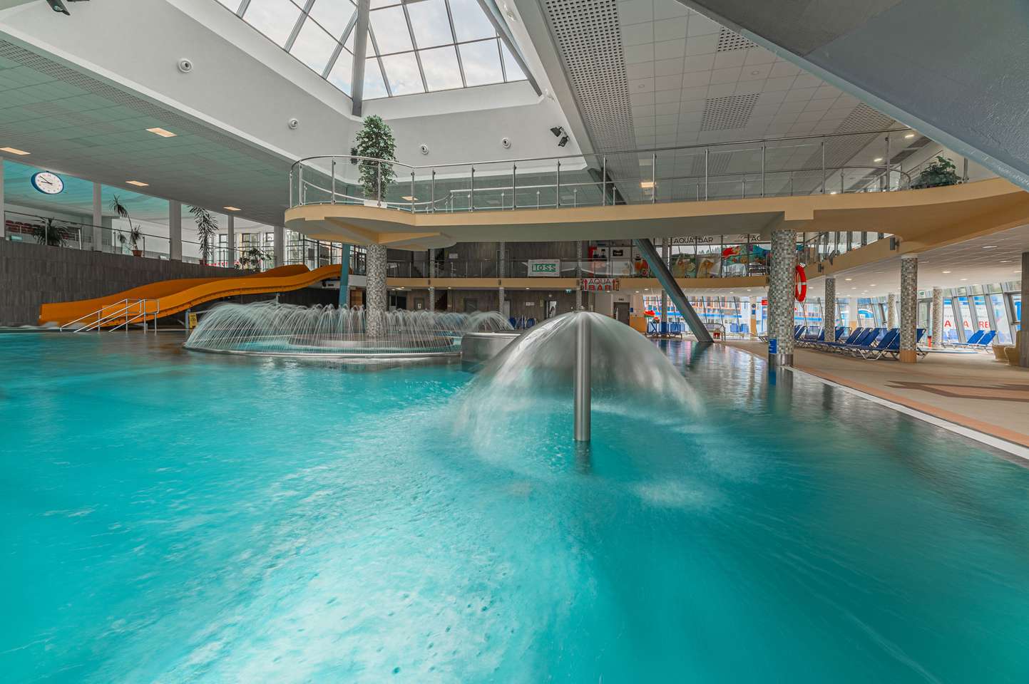Súčasťou bazénu a jeho okolia sú bublinkovače, masážna lavica pre 6 osôb, 3 masážne sprchy, vodný hríb, 6 masážnych trysiek, divoká rieka, hojdací záliv, ostrov, 2 vírivé vane s teplotou vody 36 °C, 4 vyhrievané lavice, 200 lehátok, 2 fontánky s pitnou vodou , 2 tobogany, 2-šmykľavka NIAGARA a relaxačná terasa na opaľovanie v letnej sezóne.